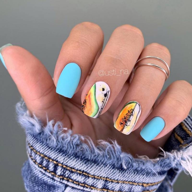 Цвет голубого летнего неба станет прекрасным вариантом для маникюра. Он подходит практически к любому оттенку кожи и добавляет завершающий штрих любому образу. Можно выбрать однотонный вариант, а можно сочетать его с фруктовым рисунком — оба дизайна будут выглядеть круто.