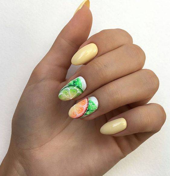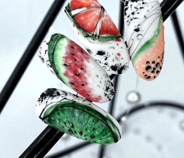 В тренде летний маникюр с клубникой, арбузом, малиной, ананасом, бананом, киви, авокадо и даже с изображением апельсина и лимона.
