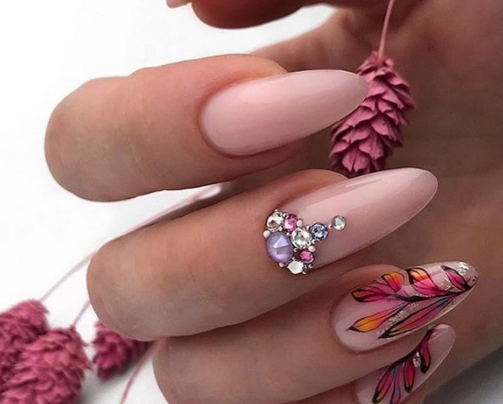 Достаточно популярны среди обладательниц длинных ногтей. Могут стать основой для создания идеального летнего маникюра, в сочетании с яркими цветами. В данном случаи стразы используются в качестве акцента на одном или нескольких пальцах.