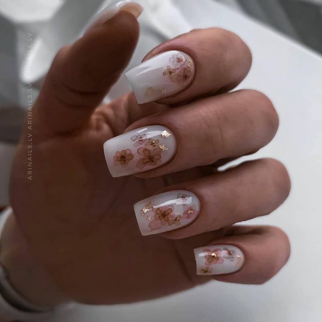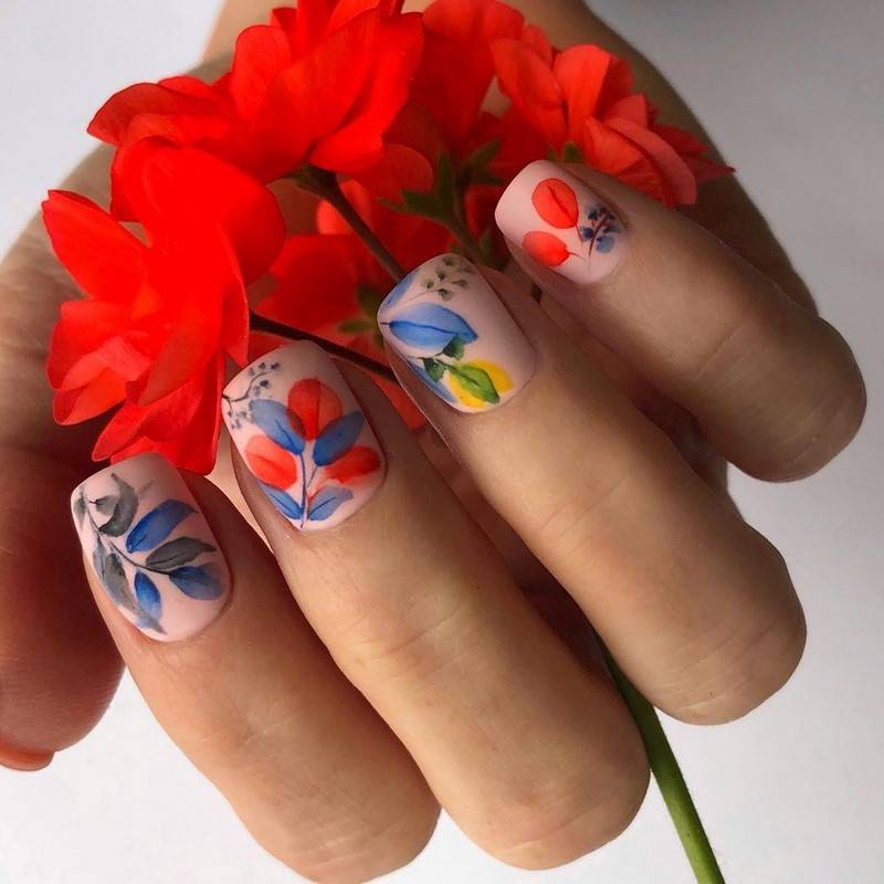 Рисунок акварелью в виде цветов и других флористических мотивов будет мust нave в летнем маникюре сезона 2020. Цветочный рисунок может быть в стиле минимализм (простой и маленький в виде акцента), а может быть и целая роспись на ногтях. Также в виде росписи акварелью очень красиво смотрятся бабочки, птички, которые тоже можно изобразить в летнем маникюре.