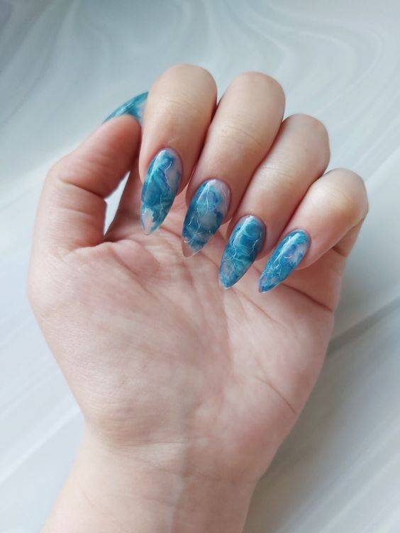 Прохладный бирюзовый и синий с золотистыми бликами дополняют практически любой оттенок кожи. Вам захочется заказать поездку на море каждый раз, когда вы смотрите на свой маникюр.