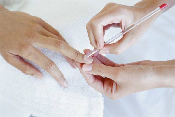 После удаления заусенцев и кутикулы, нужно обработать ноготь пилкой. В идеале – стереть верхний слой пластины. Старайтесь ее при этом не повредить.