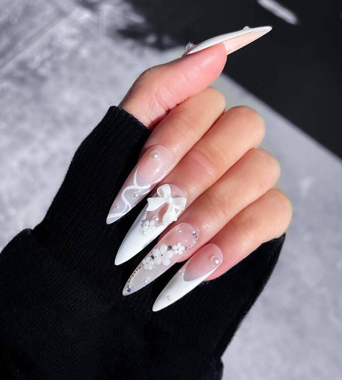 На ногтях невесты будто появляются живые цветы или объемные бантики, в основном белого и нежно-розового цвета.