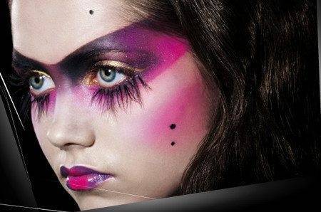 - Киберстиль. Лицо, как и в классической версии, белое. Тени для глаз и помада – ярких, ядовитых, очень насыщенных оттенков. Причем используют любые цвета. Особенность стиля – нанесение на лицо рисунков, которые создают с помощью специальных красок.Рисунки каждый выбирает сам, главное условие – техническая стилистика. На них могут присутствовать различные линии и точки, напоминающие о механизмах и электронике. Можно рисовать даже целые элементы механизмов или микросхемы.