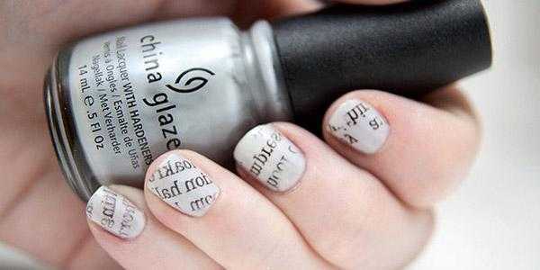 Важно помнить, что для этого маникюра подходит именно газетная бумага с типографской краской, а не журнал, так как с глянцевых поверхностей принт на ноготь не перенесётся.