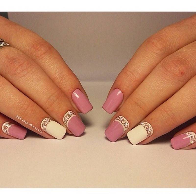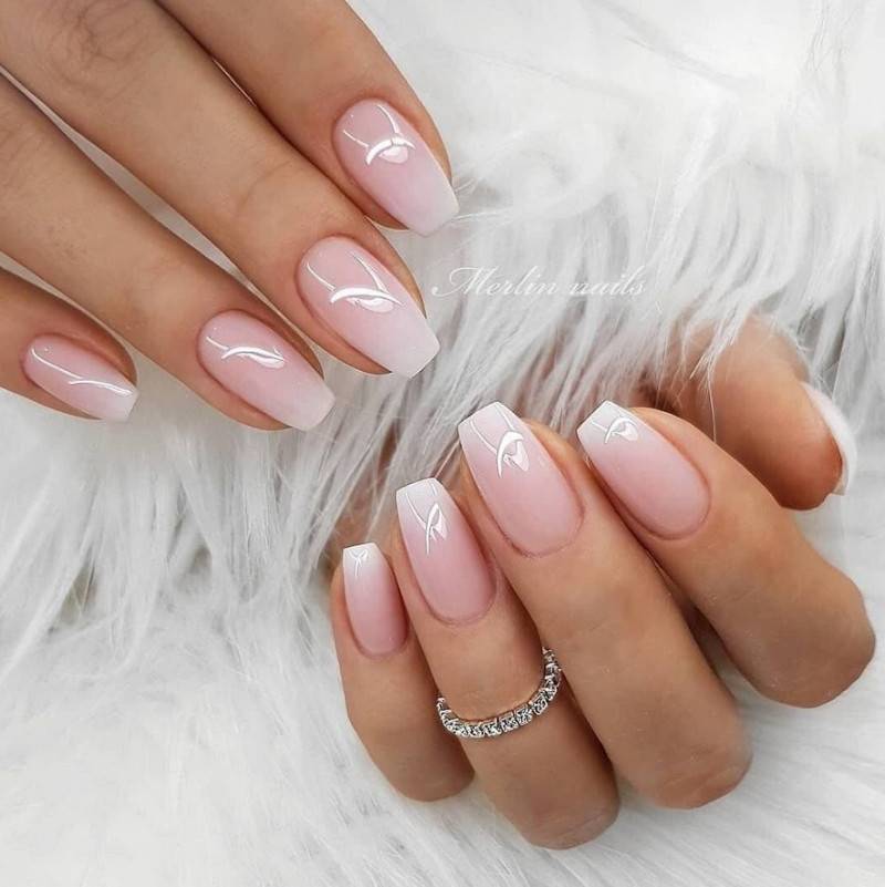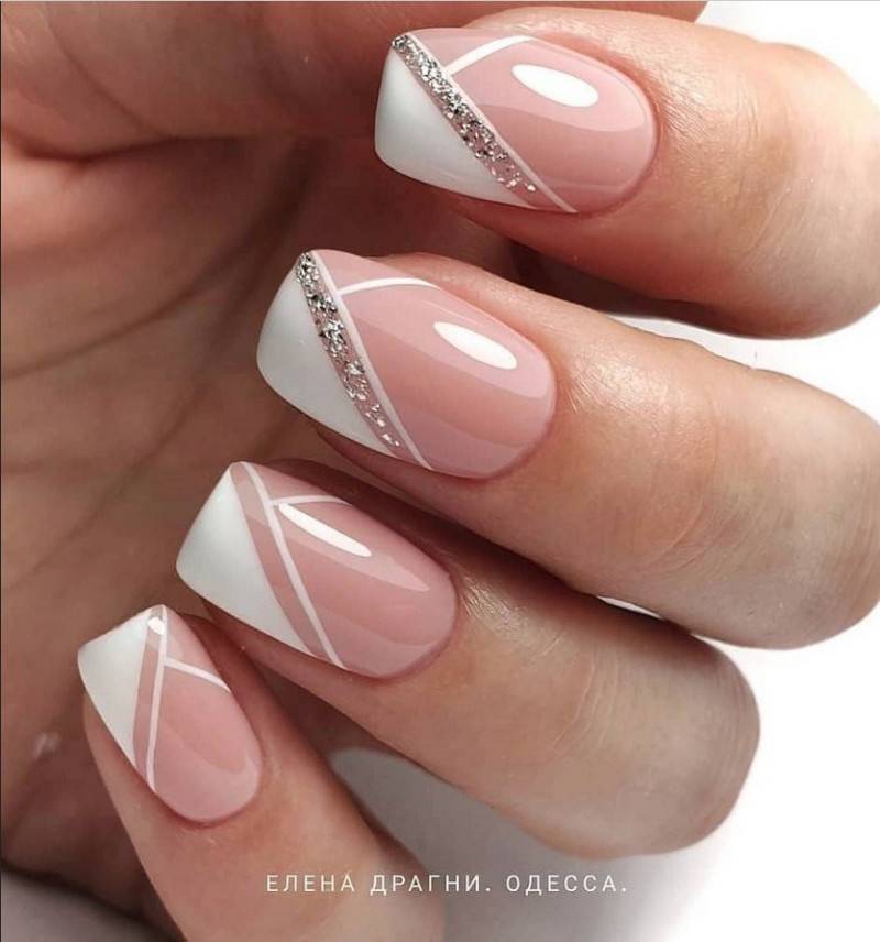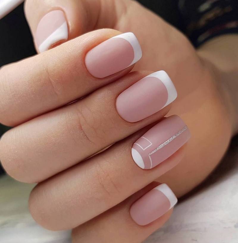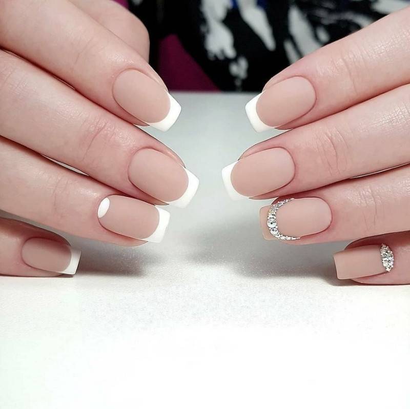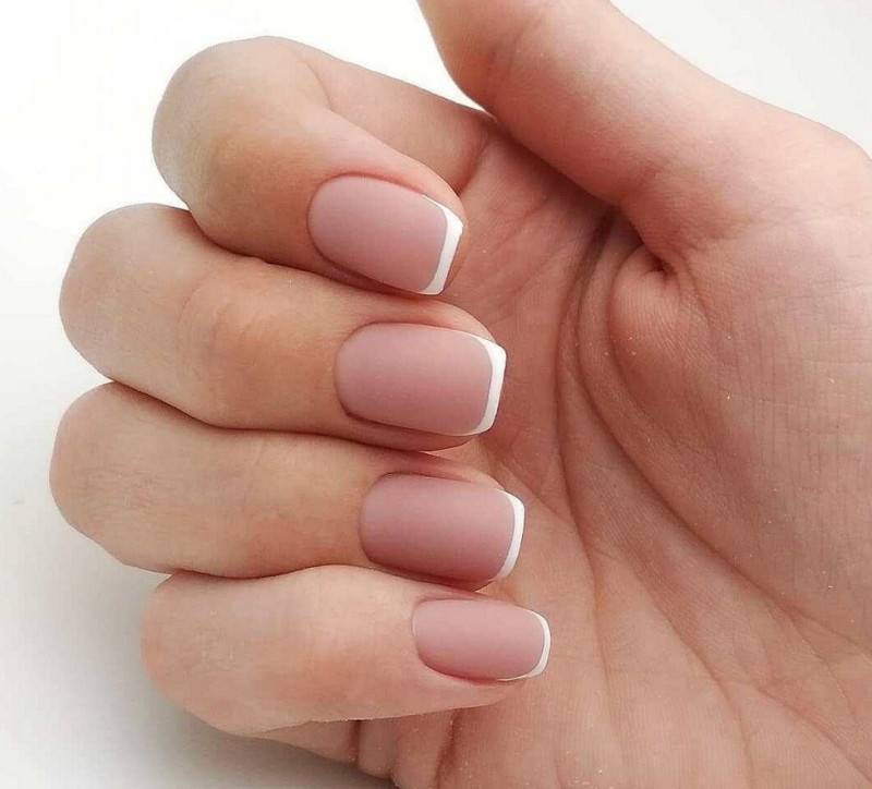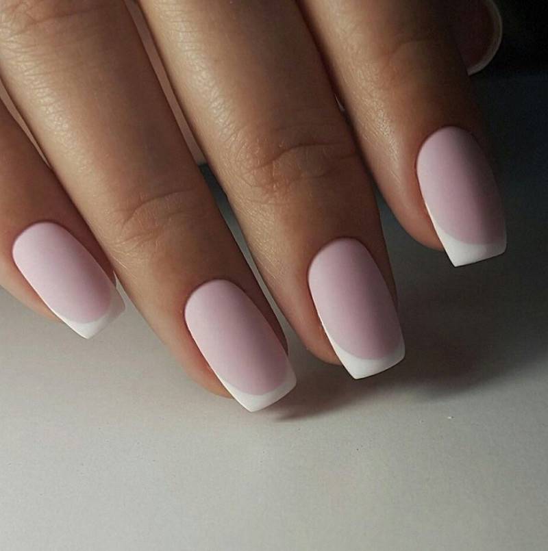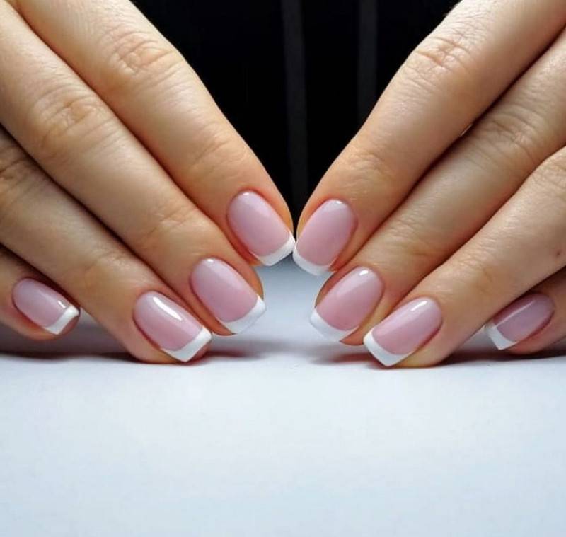 Самый нежный французский маникюр получается при использовании классической комбинации оттенков – белого с телесным или светло-розовым. Стильные белые кончики придадут ногтевым пластинам изящность и привлекательность.