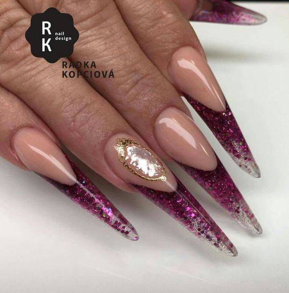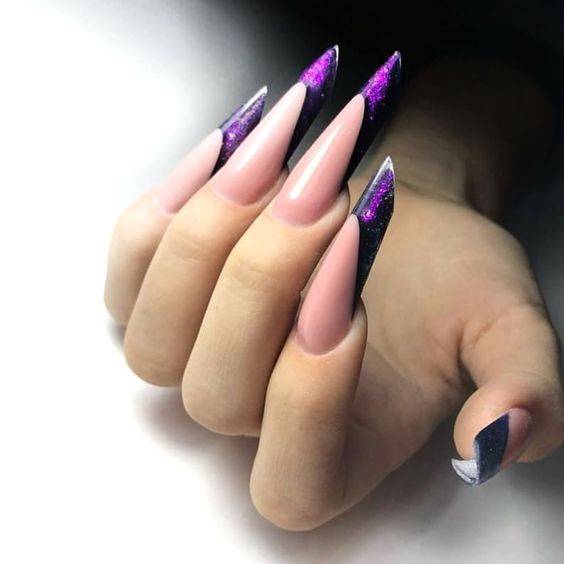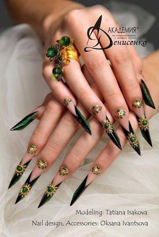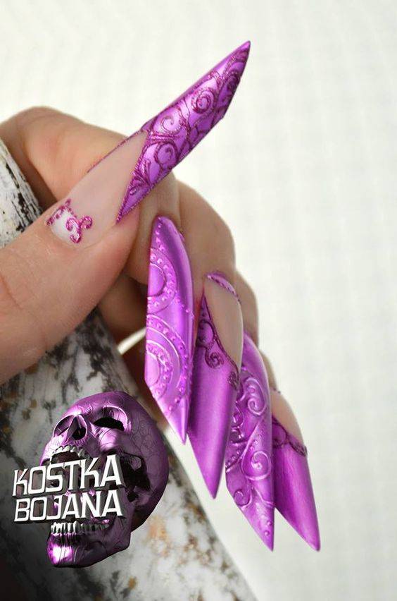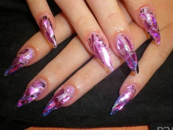 Более экстремальный вариант острого маникюра — ногти-пики. Здесь мастер формирует довольно тонкий угол. Для такого дизайна понадобится большая длина, на короткой оформить острый пик просто не получится.