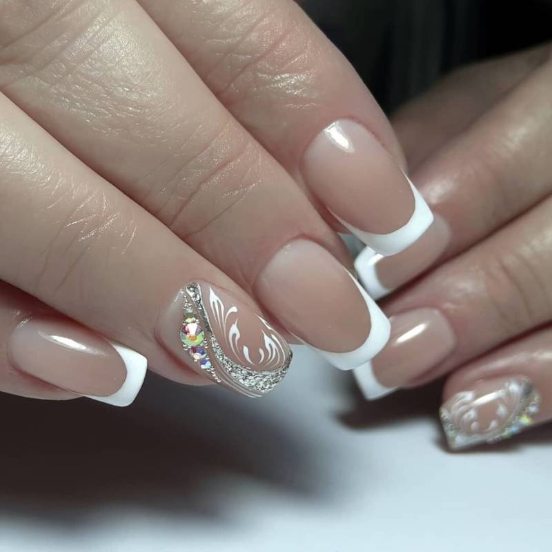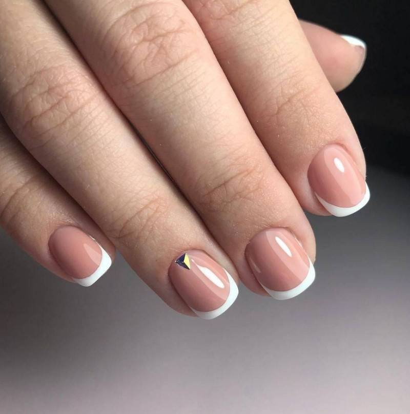 - Розовый френч с белыми кончиками и стразами у основания ногтя. Смотрятся модно и празднично в любой ситуации.