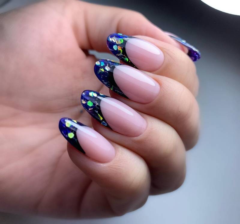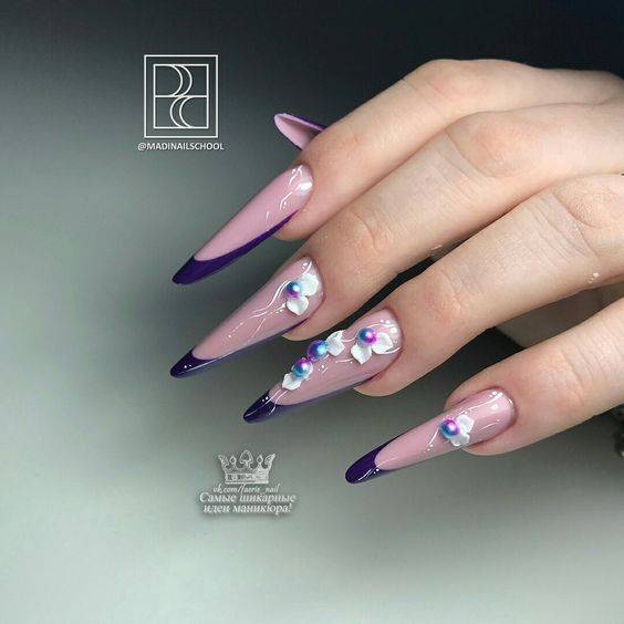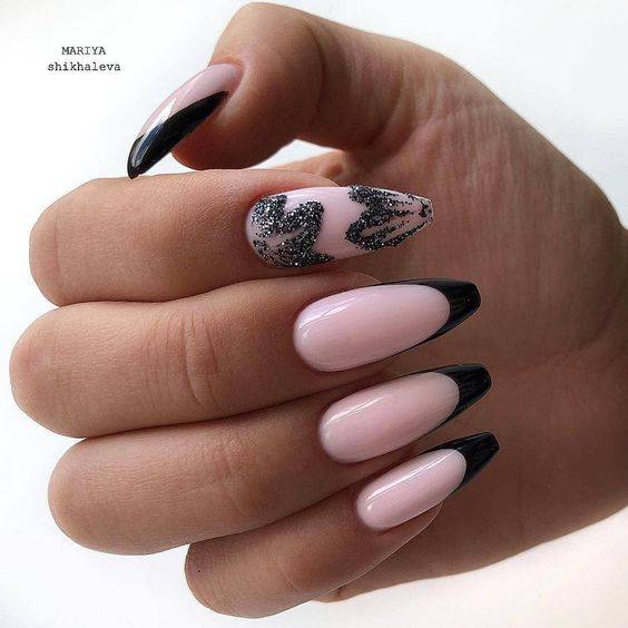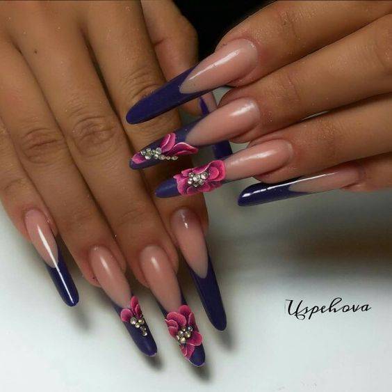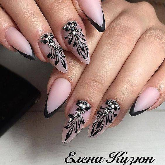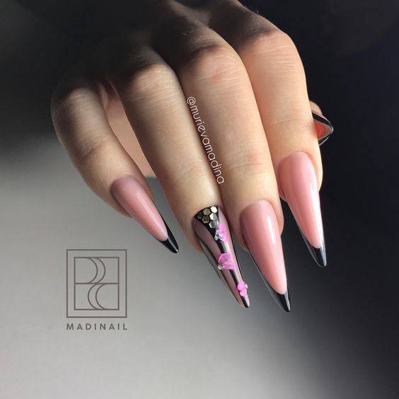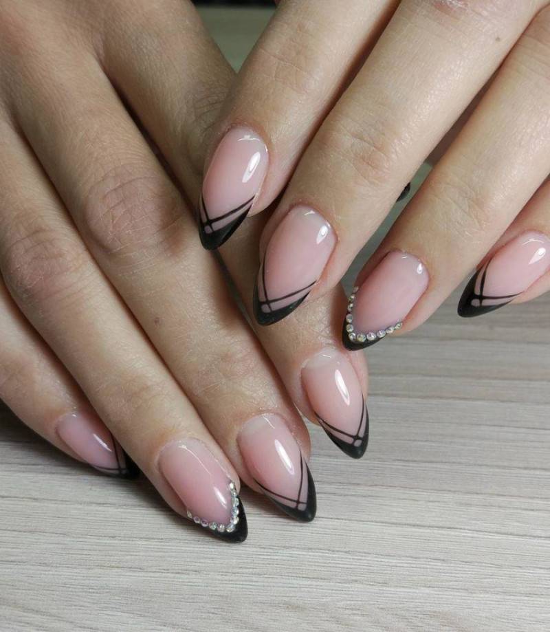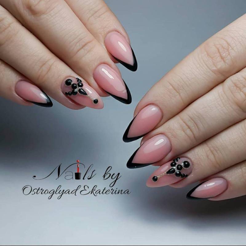 Выполняя французский маникюр на острые ногти стилет или пики, помните, что такой дизайн прекрасно подойдет для вечерних и торжественных мероприятий. Также роскошен будет черный френч. Забудьте про стереотипы, не бойтесь пробовать что-то новое и необычное.