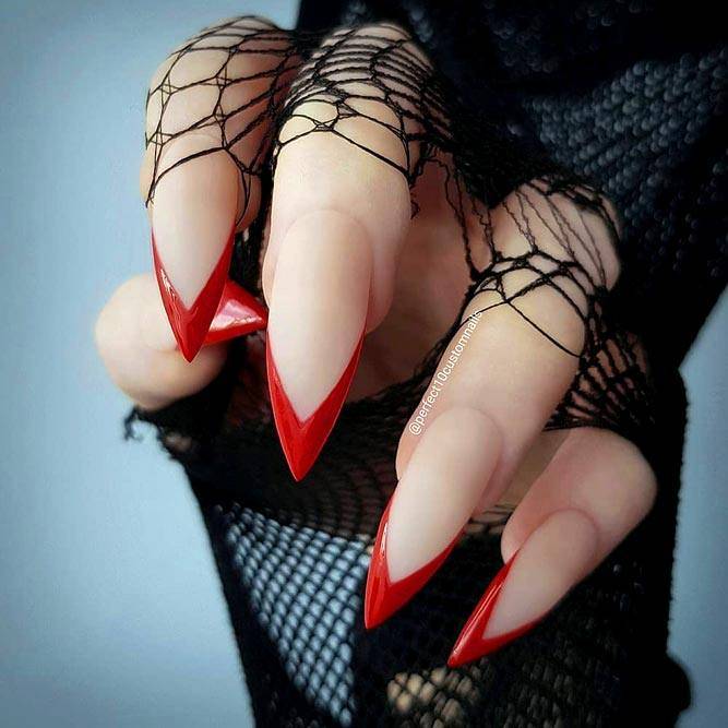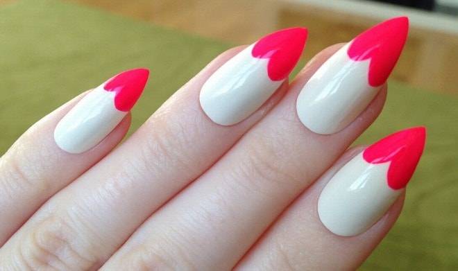 Поэкспериментируйте с френчем, сделайте его цветным. На острых ногтях эффектно смотрится улыбка в форме V.