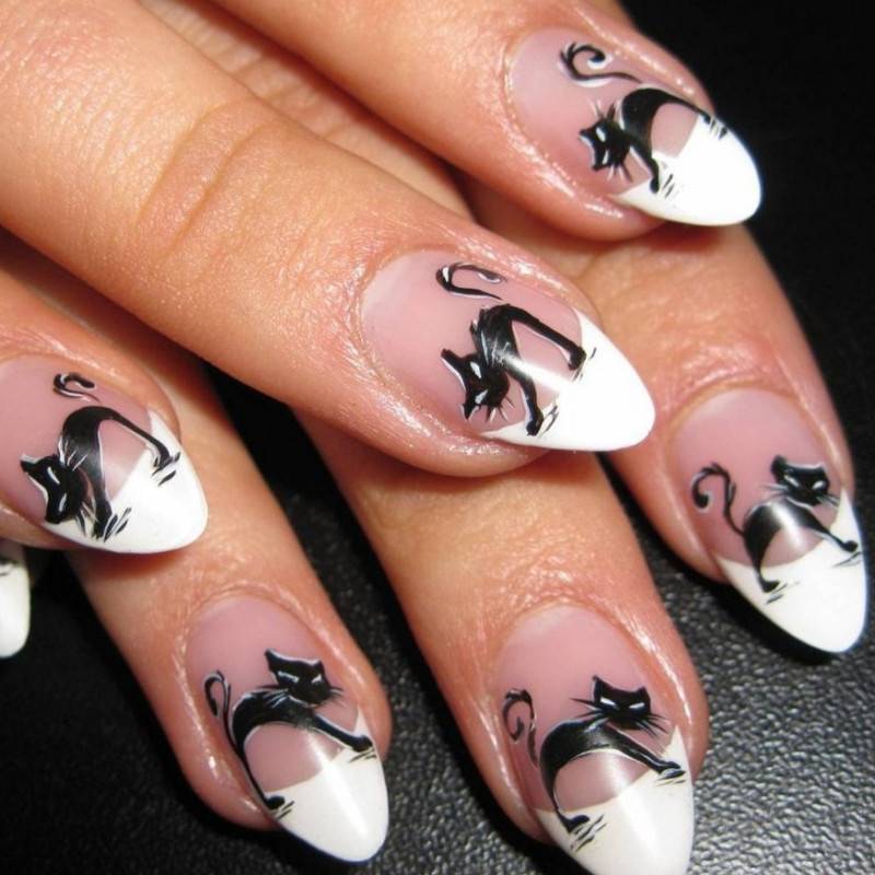 • Животный принт – если говорить конкретно об описываемых цветах, здесь зебровый дизайн будет смотреться наиболее выигрышно с его характерными черно-белыми линиями. Но не лишен смысла и леопардовый окрас, выполненный в подобной цветовой гамме. Это выглядит довольно необычно, но достаточно выразительно и акцентированно.• Кошачьи лапки – простой женский маникюр, более часто употребляемый девушками помоложе, напоминает игру противоположностей в цветах с применением отпечатков лапок проходящей по ноготку миниатюрной кошки. Такие следы добавляют дизайну милашности и умиляют своей непосредственностью.