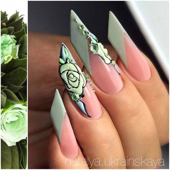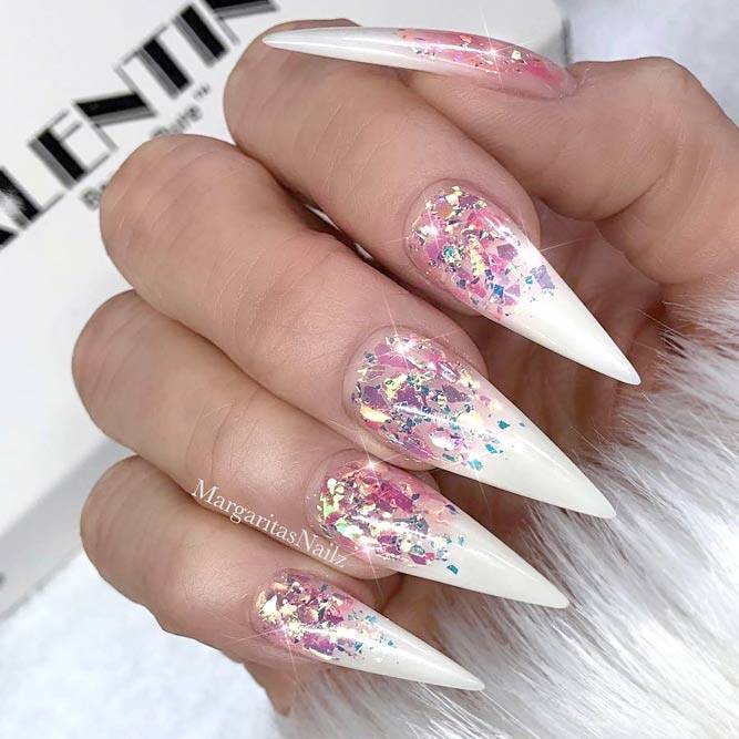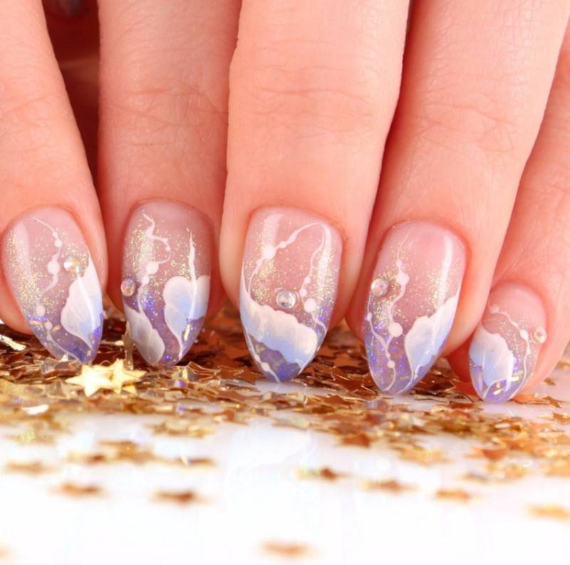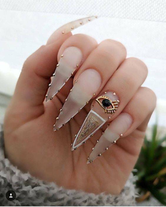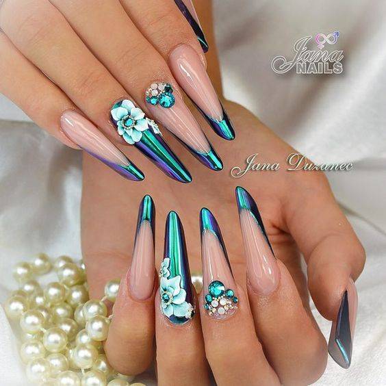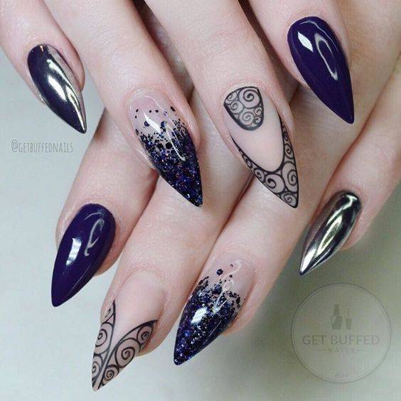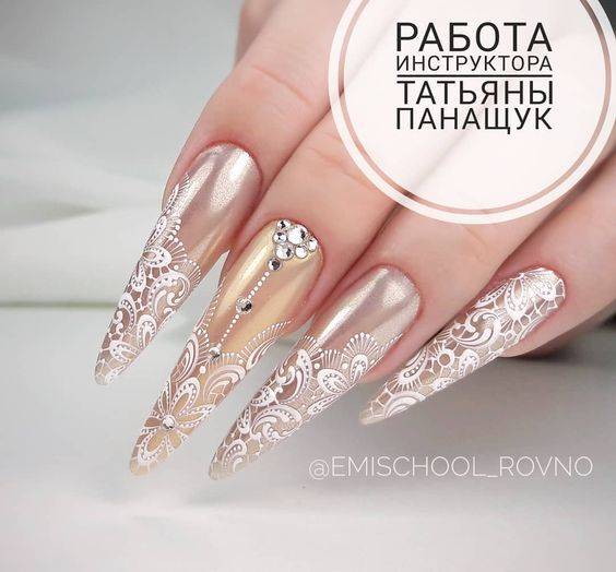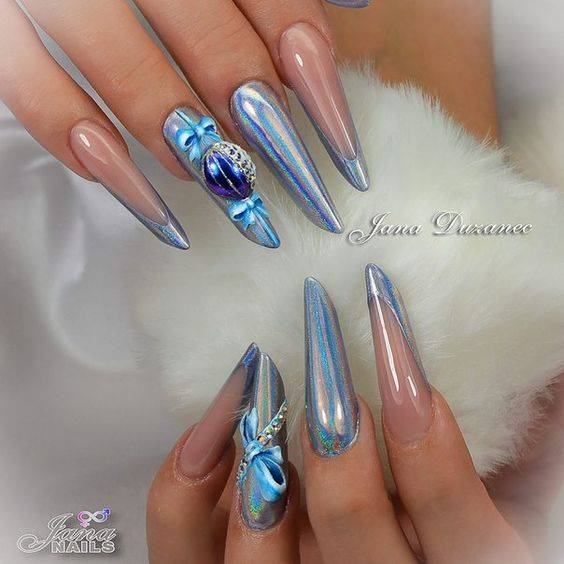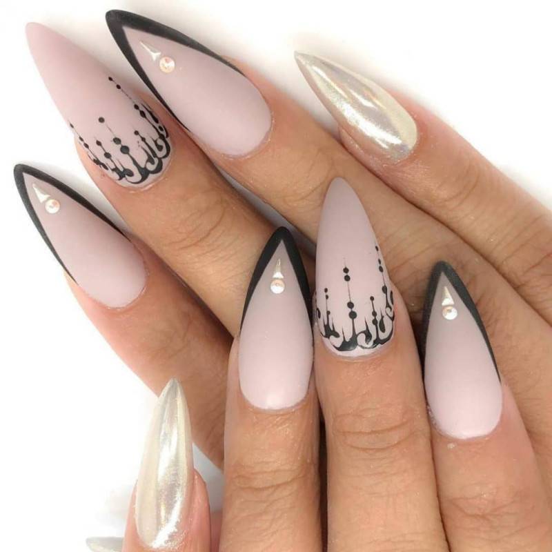 Помните, что ногти с острой формой и таким дизайном могут подойти на любой праздник. Чтобы добиться различных переливов, зеркального эффекта или бесподобного жемчужного блеска, достаточно использовать втирку: