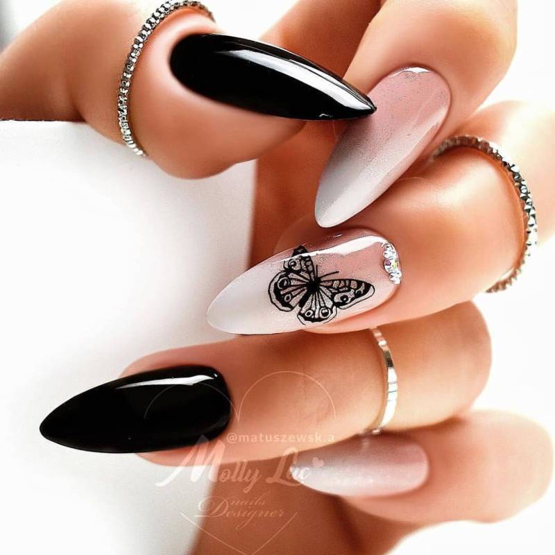Черно-белые ногти с дизайном: с рисунком, со стразами, с блестками фото 2021-2022