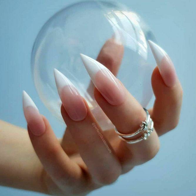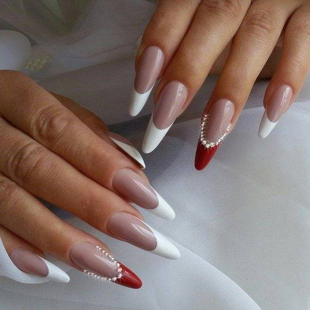 Как мы уже говорили, острая форма ногтевых пластин предполагает наличие определённой длины, что позволяет её обладательницам экспериментировать с дизайном и техниками в зависимости от ситуации и личных предпочтений. Одним из результатов подобных манипуляций можно назвать френч на острые ноготки, который представлен нейл-дизайнерами в самых различных интерпретациях. Минималистическим натурам придутся по душе классические вариации исполнения французского маникюра