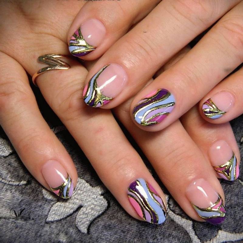 Такой маникюр выглядит как растяжка цвета, которая расплывается цветными полосками. Дизайн прекрасно подходит на длинные и средние по ногти.