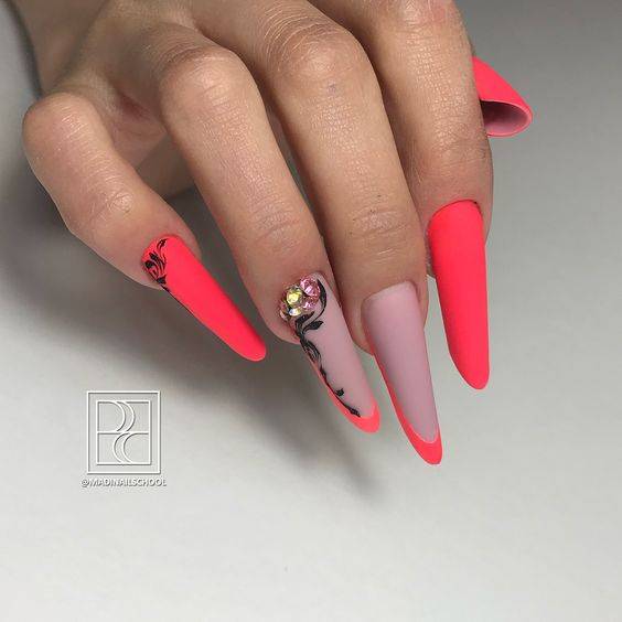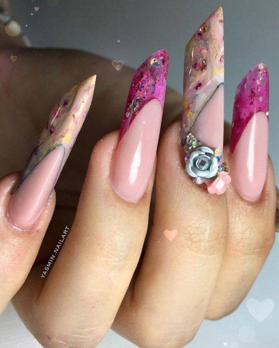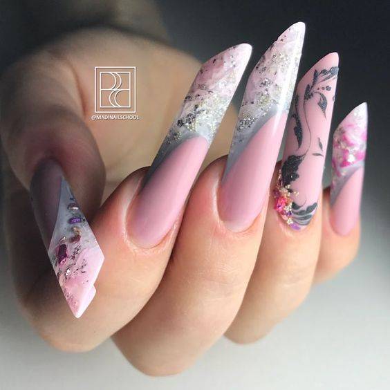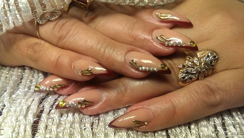 Использование в маникюре всевозможного дизайна позволяет подчеркнуть индивидуальность каждого женского образа. К тому же, это прекрасная возможность воплотить в реальность собственные фантазии. А острый маникюр с дизайном можно назвать гармоничным сочетанием изящности и выразительности для каждой модницы. Подобная форма ногтевых пластин невероятно красиво смотрится в компании с природными текстурами, например, мраморными разводами либо имитацией морской глади и не менее красиво сочетается с дизайном ночного неба или же космическим маникюром. Романтичным натурам можно использовать для дополнения цветочные изображения. Всевозможные геометрические фигуры и полоски позволят ноготкам смотреться максимально оригинально. Дорого и эффектно смотрится на острых ногтях бордовый маникюр с золотистыми блёстками либо оттисками фольги. Также, как вариант, можно оформить на пластинах одну из вариаций градиента, совместить в одном маникюре сразу несколько техник, рисунки и украшения.