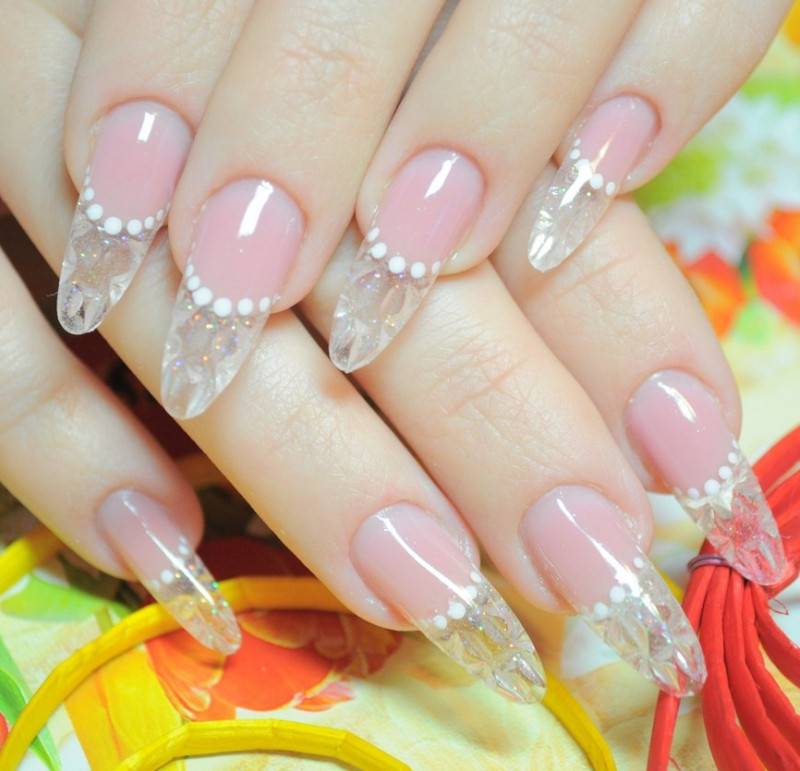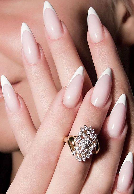 Классический дизайн на острые ногти: френч, однотонный лак, прозрачный лак
