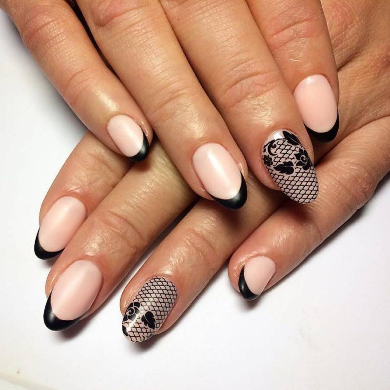 - Чёрный двойной угловой френч с ажурным рисунком из стразов. Красиво смотрится на острых и миндальных ногтях. Только на безымянном френч не рисуется, а располагается рисунок, напоминающий ажурное колье.