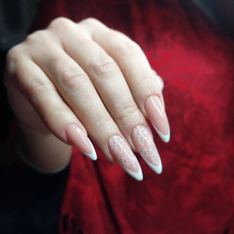 Френч на острых ногтях — это классический и элегантный вариант дизайна. Он заключается в нанесении белого или светлого лака на кончик ногтя, а затем вдоль края наносятся полоски из другого цвета или глянцевый лак. Этот дизайн подходит для любого случая — от повседневной жизни до особых мероприятий.