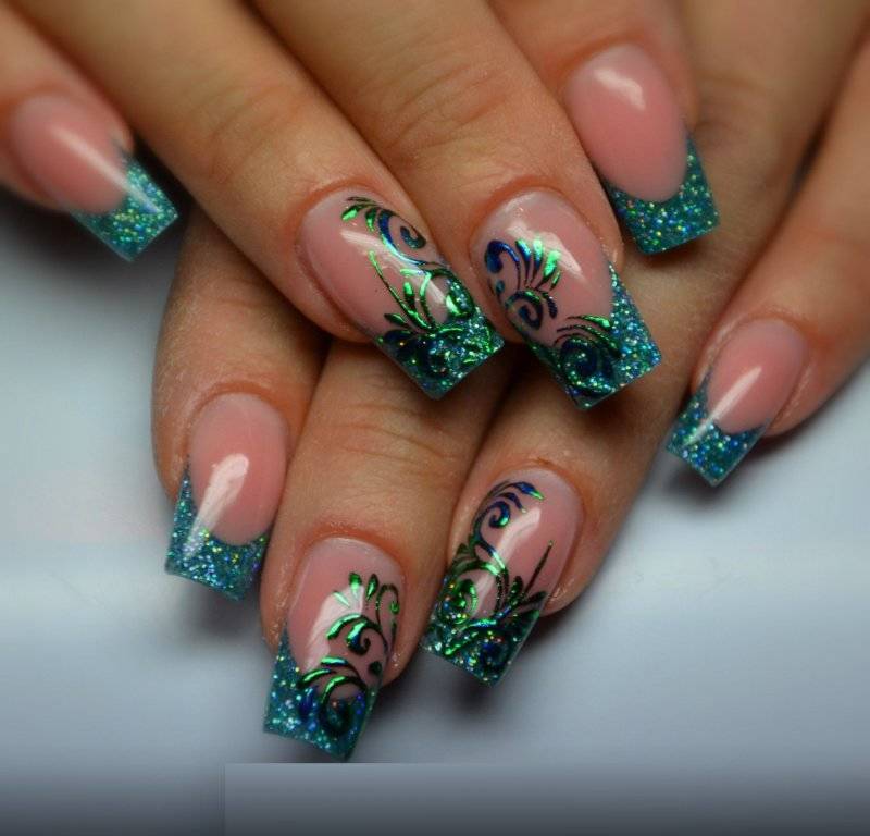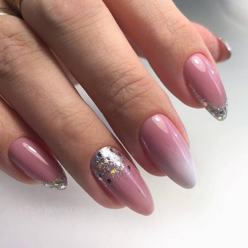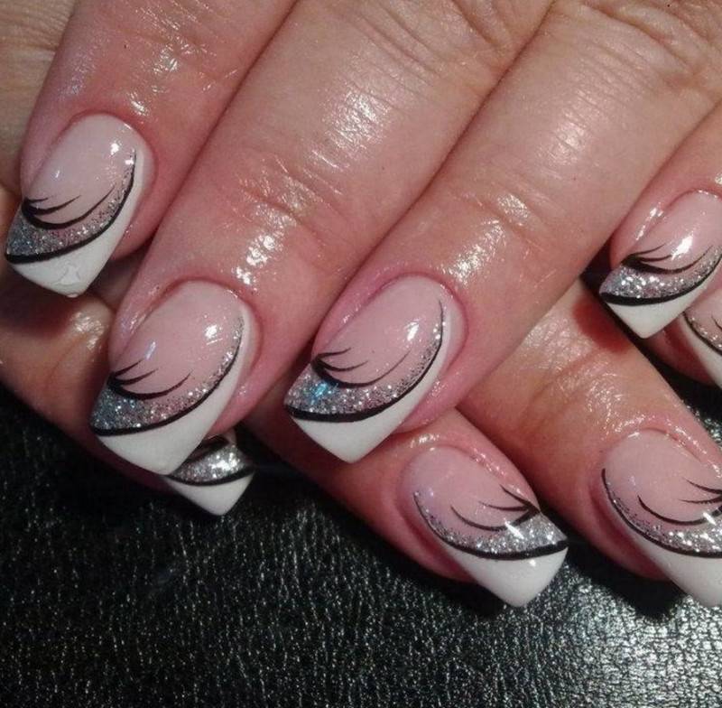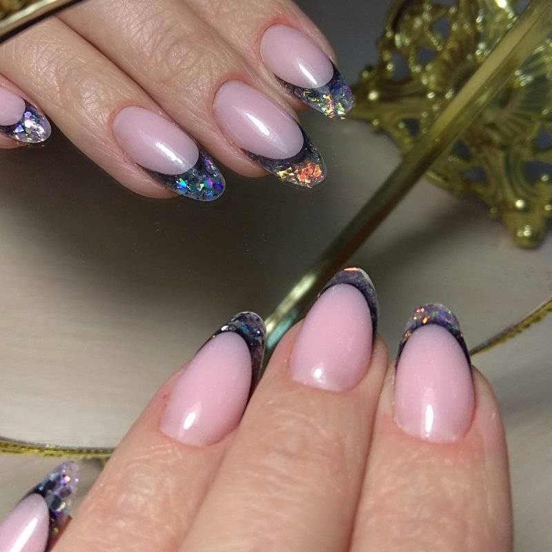 Он предполагает различные эффекты, в том числе и запотевшего матового стекла, красивые стразы и многое другое. Вот какой дизайн шикарных ногтей френч с блёстками считается самым актуальным и востребованным: