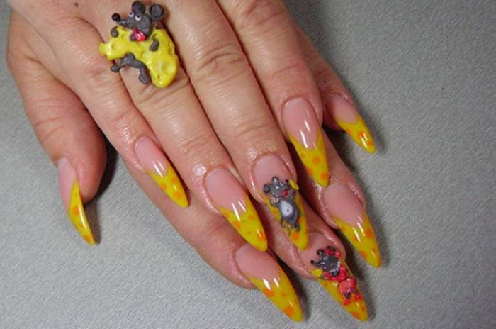Оригинальным и очень необычным станет желтый френч с горошком – имитация сыра с дырками. Помимо этого, средний палец можно украсить мышкой при помощи акриловой лепки.
