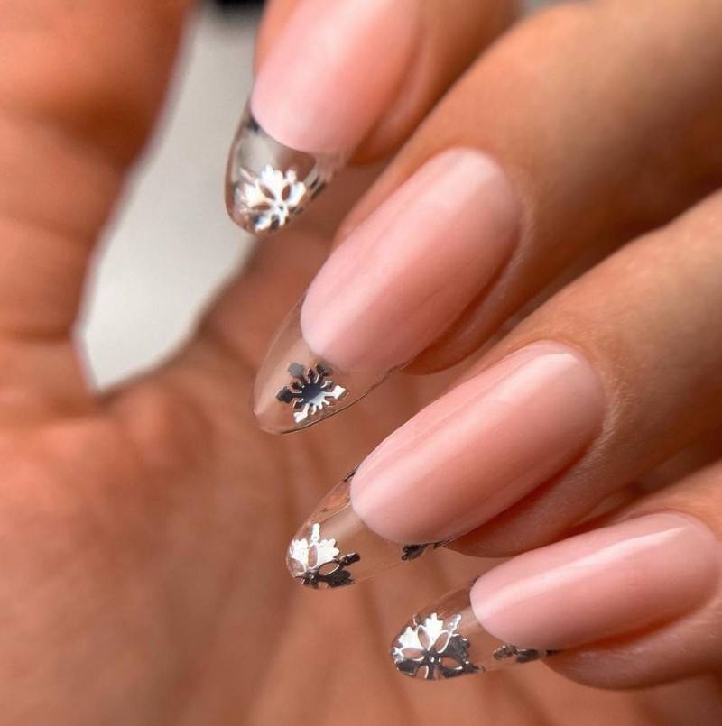 Бесцветная зона улыбки на фоне окрашенной ногтевой пластины – оригинальный вариант французского маникюра. Он получается лаконичным, но отлично сочетается с мелкими рисунками и декором стразами.