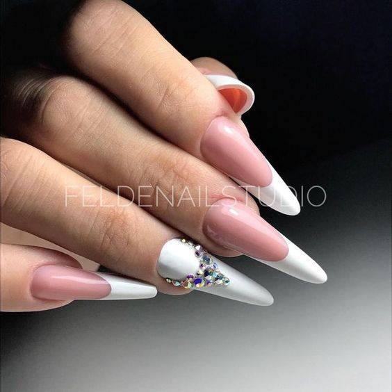 Френч на острых и очень длинных ногтях в форме стилет предназначен для особых случаев. Такой маникюр прекрасно и смело подчеркнет праздничный или вечерний лук. Острый френч стилет, декорированный блестками и стразами, выглядит своеобразно. А оригинальные рисунки на улыбке или френч ярко красного цвета, дополненный лепкой, привлекут взгляды окружающих. Замечательно и необычно выглядит френч на острых и очень длинных ногтях с рисунком на улыбке под названием «скрепка». Выполняется такой рисунок в основном в бело-черном цвете. Френч стилет выбирают смелые и уверенные в себе дамы, которые не бояться бросить вызов обществу.