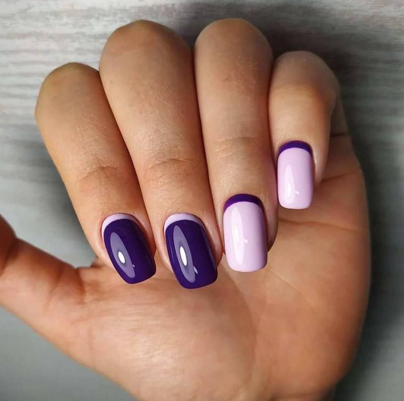 Как выглядит френч, в котором линия улыбки выполнена двумя оттенками? Его можно смело назвать дерзким и неизбитым вариантом классического дизайна. Лучше брать контрастные тона, например, любой яркий и пастельный или белый и неоновый.