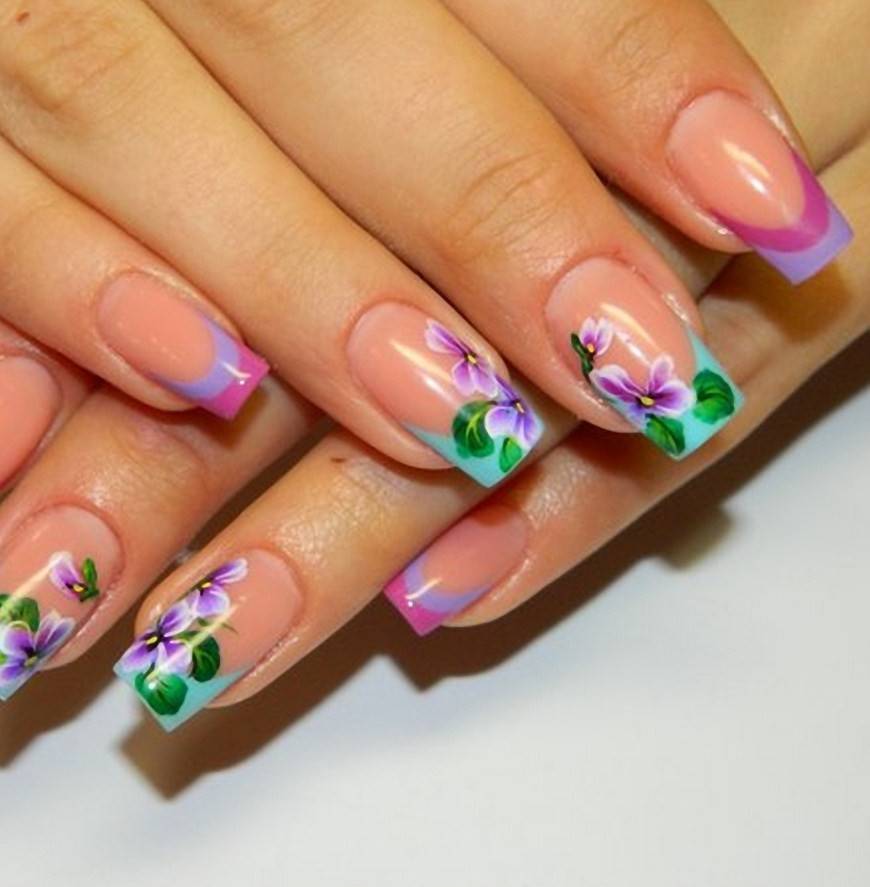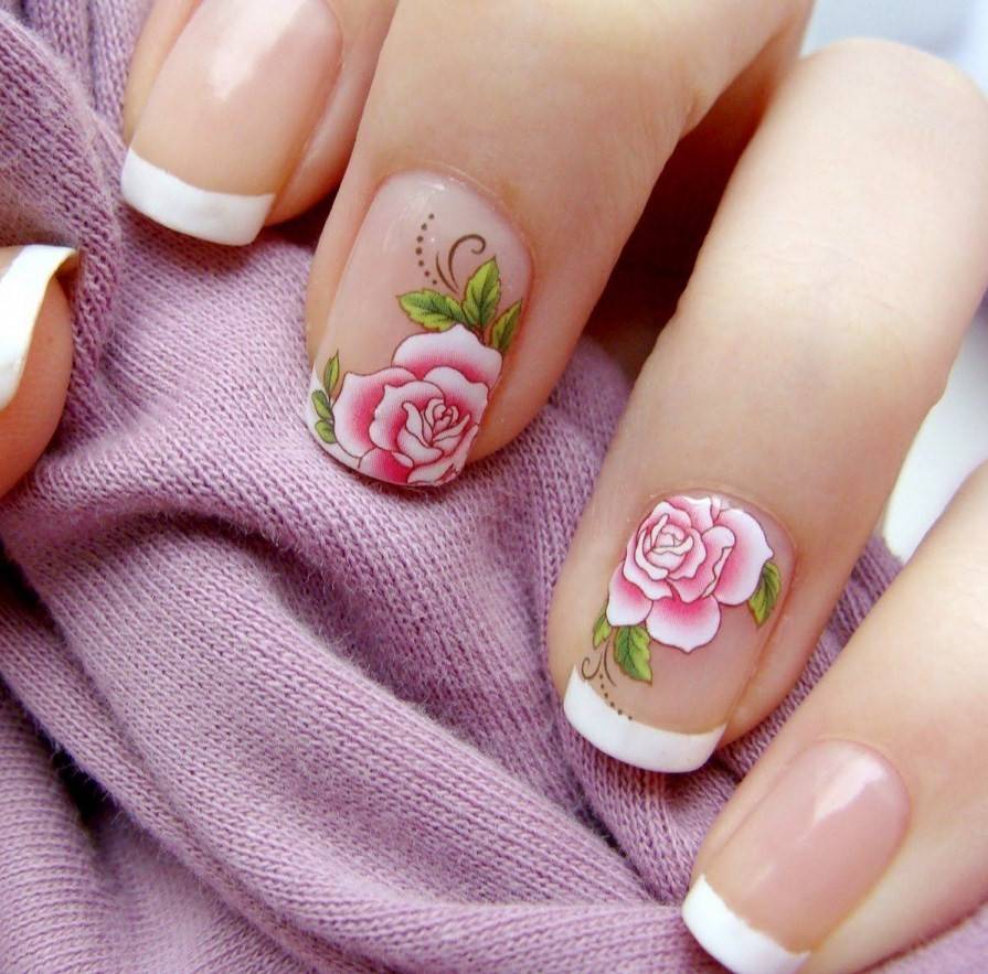 Найти фото маникюра с флористическими картинками несложно, ведь подобный дизайн считается наиболее популярным. Дополнить френч цветочками, листиками, веточками – шикарная летняя идея.