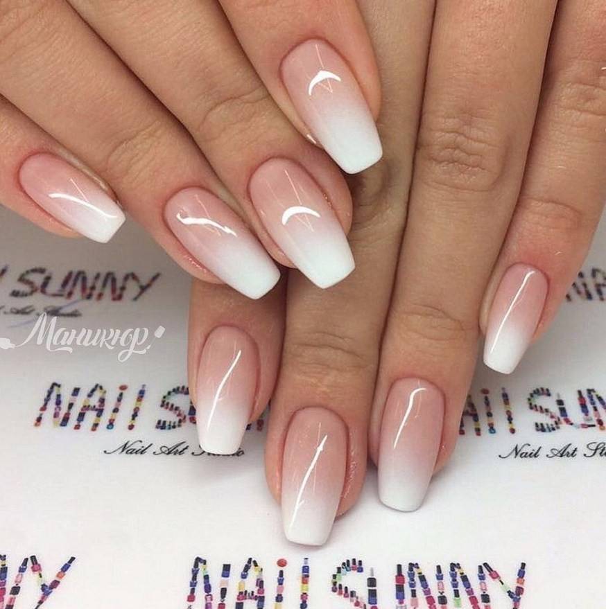 Самый нежный французский маникюр получается при использовании классической комбинации оттенков – белого с телесным или светло-розовым. Стильные белые кончики придадут ногтевым пластинам изящность и привлекательность.