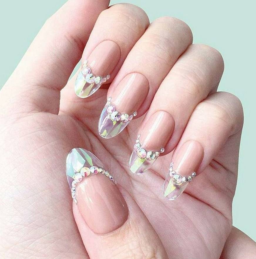 Помните, что ногти с острой формой и таким дизайном могут подойти на любой праздник. Чтобы добиться различных переливов, зеркального эффекта или бесподобного жемчужного блеска, достаточно использовать втирку: