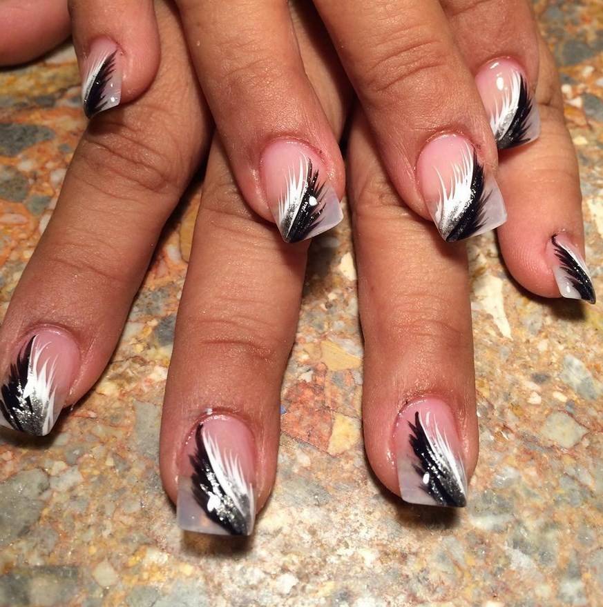 • Гусиная лапка – очень необычный и любимый всеми вариант принта, который мастер может как создать собственноручно, так и воспользоваться соответствующими заготовками в виде стикерованных наклеек. При этом основа может быть как черной, а узор белым, так и наоборот. • Обратный френч – классический французский маникюр в такой цветовой гамме смотрится удачно с белым базисом и черными улыбками, а вот обратный (лунный), хорош и в таком, и в противоположном окрашивании основы и зоны лунулы. Поэтому немудрено, что девушки активно применяют его на своих ноготках, особенно, если они острые.• Полосатый принт – следующие в горизонтальном, вертикальном, диагональном направлении параллельные линии всегда хорошо сочетаются и смотрятся в этой цветовой группе. Поэтому есть смысл украсить ноготки именно в таком варианте, можно даже на разных ногтях воспользоваться разным векторным направлением прямых – эффект в любом случае будет довольно привлекательным.• Лабиринт – дизайн ногтей, напоминающий дорогу путника, ведущую по квадратному периметру от краев ногтевой пластины к ее центру, что выглядит необычайно интересно. Удачно в этом случае в качестве основы выбирать именно белый, а черным вести линию.