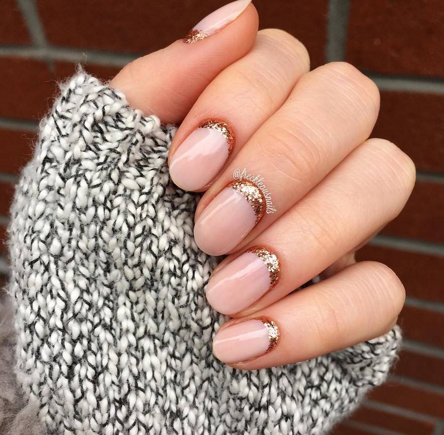 Он предполагает различные эффекты, в том числе и запотевшего матового стекла, красивые стразы и многое другое. Вот какой дизайн шикарных ногтей френч с блёстками считается самым актуальным и востребованным: