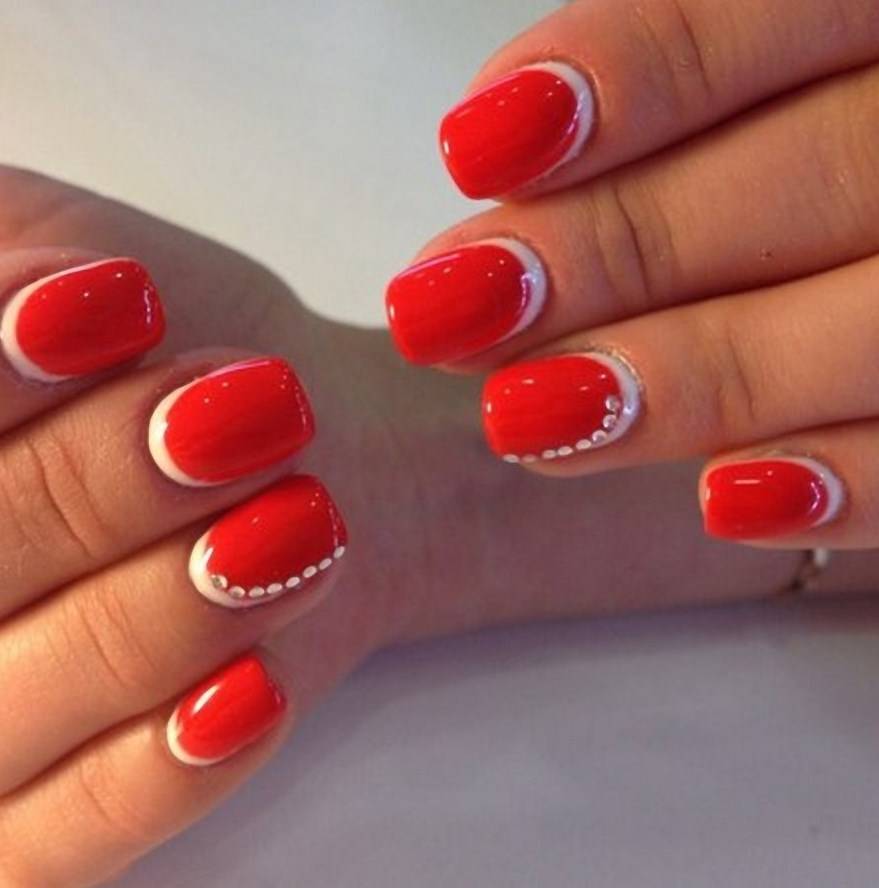 - Розовый френч с белыми кончиками и стразами у основания ногтя. Смотрятся модно и празднично в любой ситуации.
