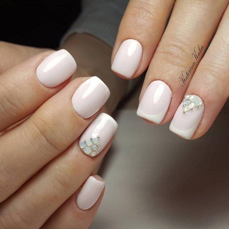 Классический французский маникюр великолепно смотрится на коротких ногтях и идеально подходит для утонченного образа невесты. Для многих девушек понятия свадебного и французского маникюра давно стали синонимами. Выступающий край ногтевой пластины может быть окрашен не только в белый, но и в любой другой светлый цвет, например, серебристый, розовый или лиловый. Если же вы решили украсить френч небольшими стразами или рисунком, не забывайте о чувстве меры.