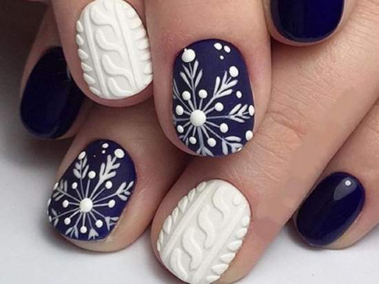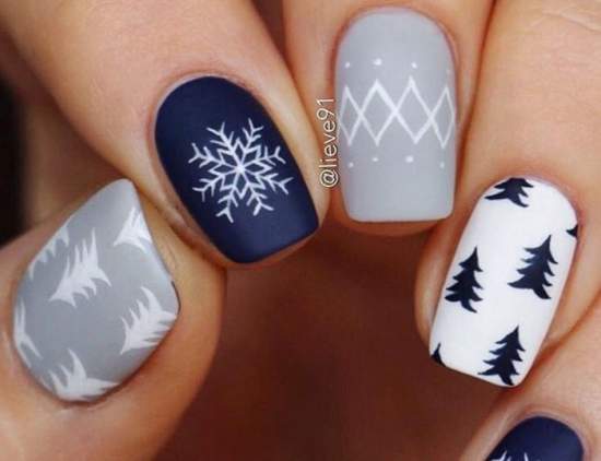 Синий для холодного времени года идеально впишется в зимний образ. Он прекрасно контрастируют с базой, создавая интересный дизайн.