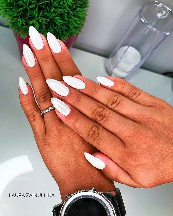 Однотонное покрытие понравившегося оттенка гель-лака подойдет для скромного и минималистичного свадебного маникюра на миндальных ногтях.