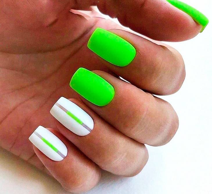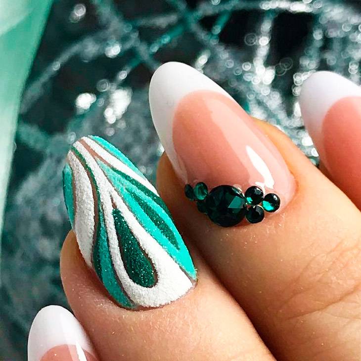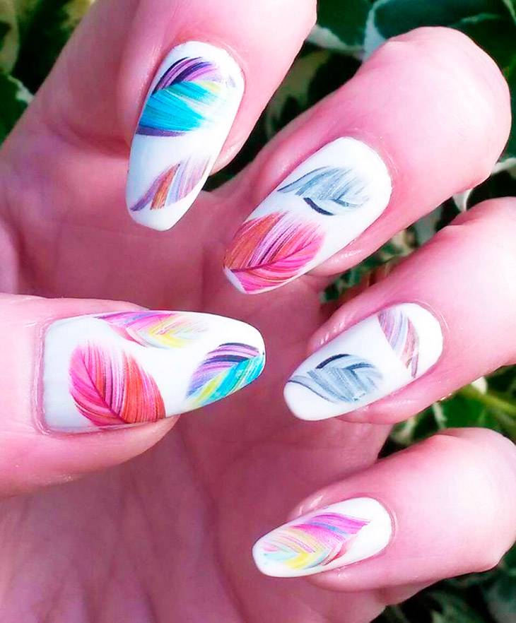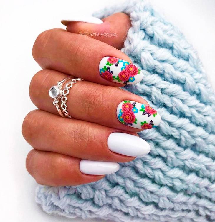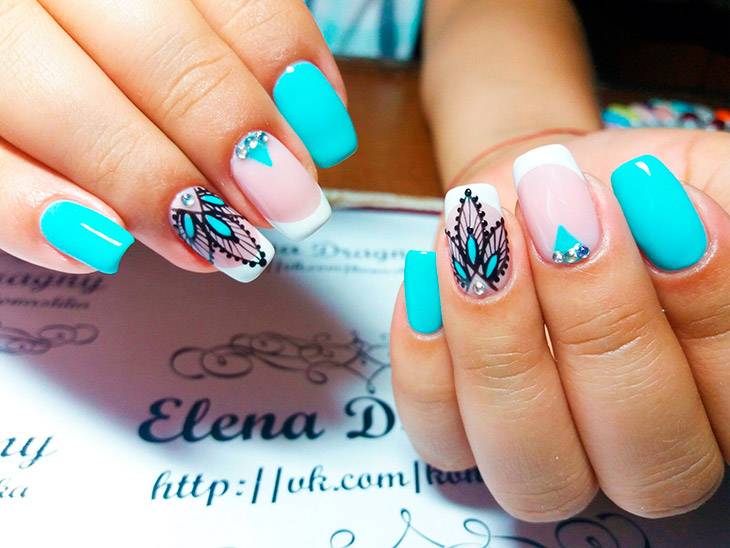 Если говорить о наиболее подходящих вариантах красочного и яркого маникюра, то обратите особое внимание на белые ногти с синим, бирюзовым, зеленым, розовым и персиковым