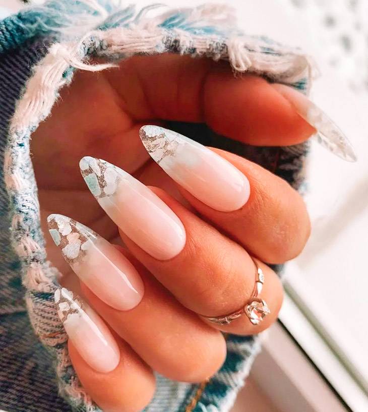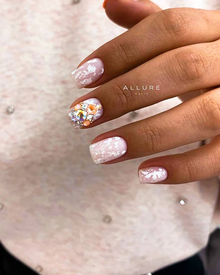Такой маникюр тоже хорошо подойдёт будущей невесте. Ноготки будто покрывают хрусталём, в котором содержатся маленькие блестящие крупинки. Короче, это очень красиво!