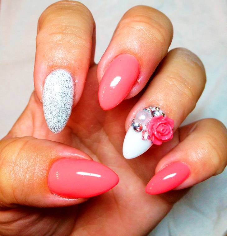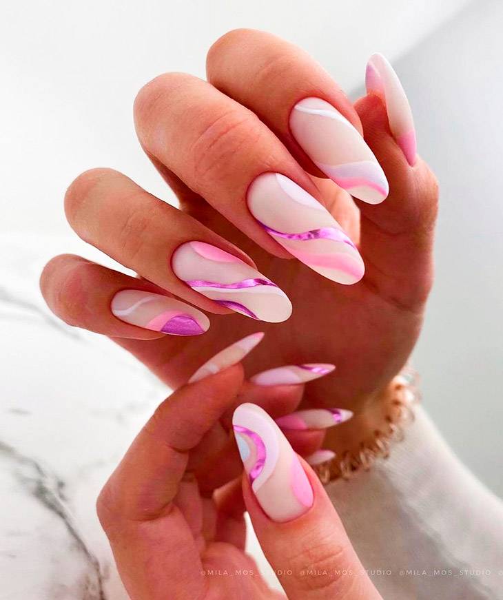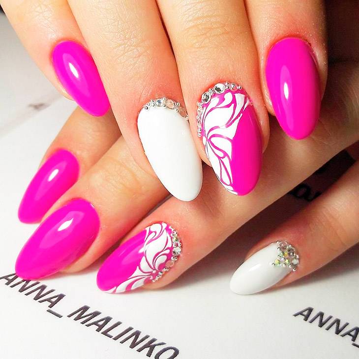 На длинные или же средней длины ногти попробуйте сделать либо классический френч в современном исполнении. Дополнительно добавьте принтов или украсьте ноготки в розовой гамме стразами.