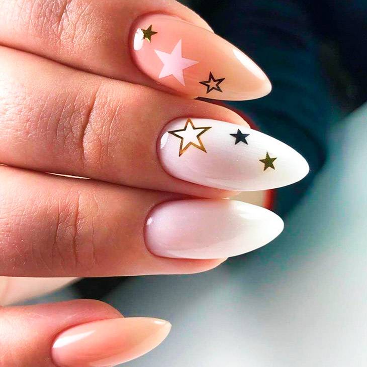 Острые длинные ногти – символ сексуальности, смотрятся достаточно вызывающе, поэтому такое оформление больше подойдет для выхода в свет или фотосессии. Многие звезды любят длину, дополненную в комбинации с серебряным или же золотым шиммером.