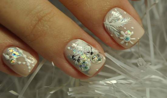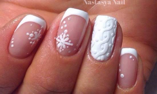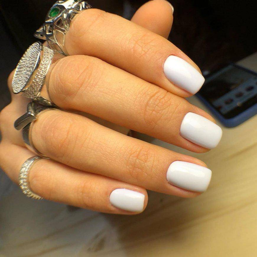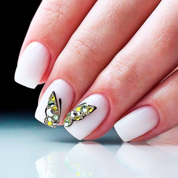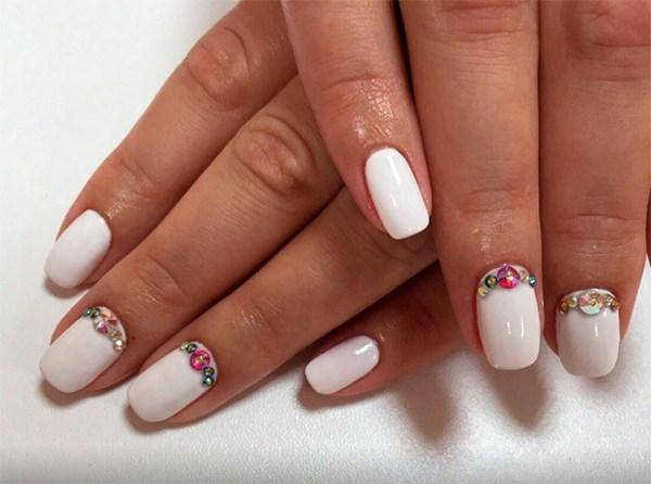Стразы, паутинка, фольга и даже блестки – основные детали для декора коротких ногтей. Белый – прекрасный фон для нейл-арта, выглядит очень нежно и одновременно стильно. Это, пожалуй, самый интересный маникюр в этом году. В основном в такой цветовой палитре делают французский маникюр.