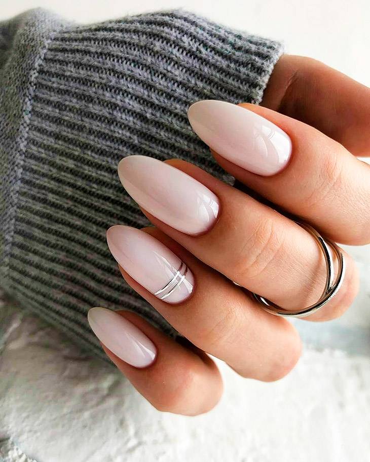 Это всегда смотрится очень хорошо. Ровные линии на ногтях золотого, серебряного цветов отлично подойдут к однотонному покрытию.