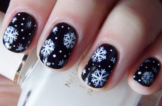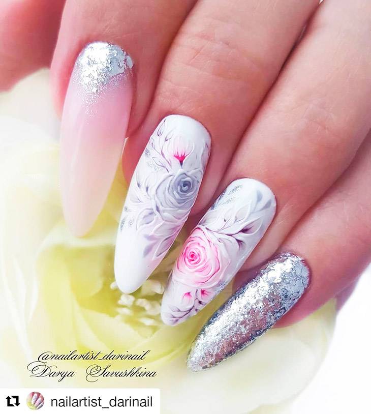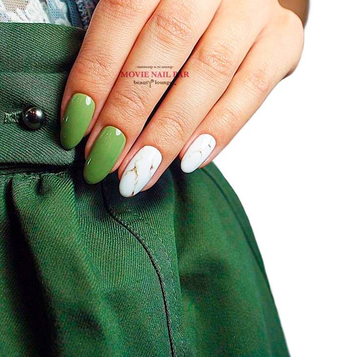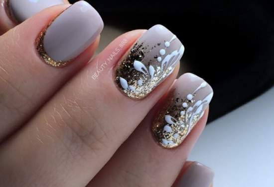 В сочетании с серебром такой вариант становится идеальным для свадьбы и других праздничных мероприятий. Если не перебарщивать со стразами, то можно выбрать этот вариант и на повседневку. Красиво выглядит френч, лунный, авангардные рисунки, втирка и роспись.