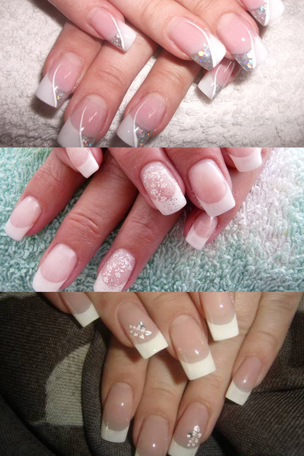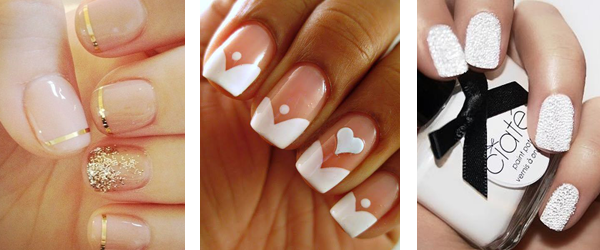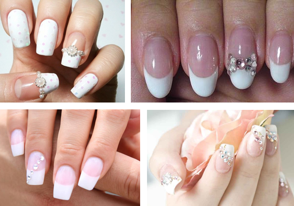 Самый популярный свадебный дизайн ногтей – это французский маникюр – аристократичный и сдержанный, специально для свадебного торжества может быть украшен стразами, блестками, фольгой. Это, пожалуй, тот единственный случай, когда французский маникюр не универсален и не подойдет под любую одежду. Длина ногтей не имеет большого значение, небольшой выход края ногтя (3-4 мм) дает возможность создать красивый дизайн свадебного маникюра.
