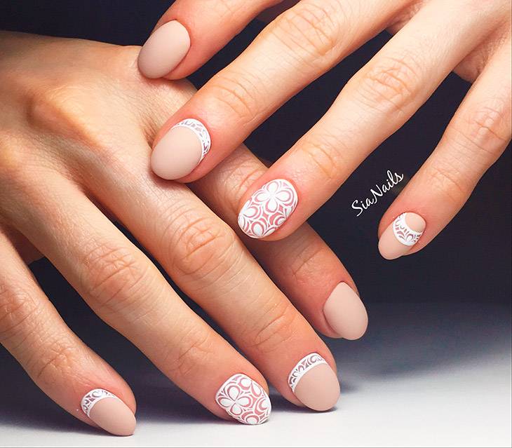 Бежевый в белом оформлении поразит своей нежностью и лёгкостью. Он создаст абсолютно совершенный образ невесты. Стилисты рекомендуют свадебный маникюр в бежево-белых тонах.