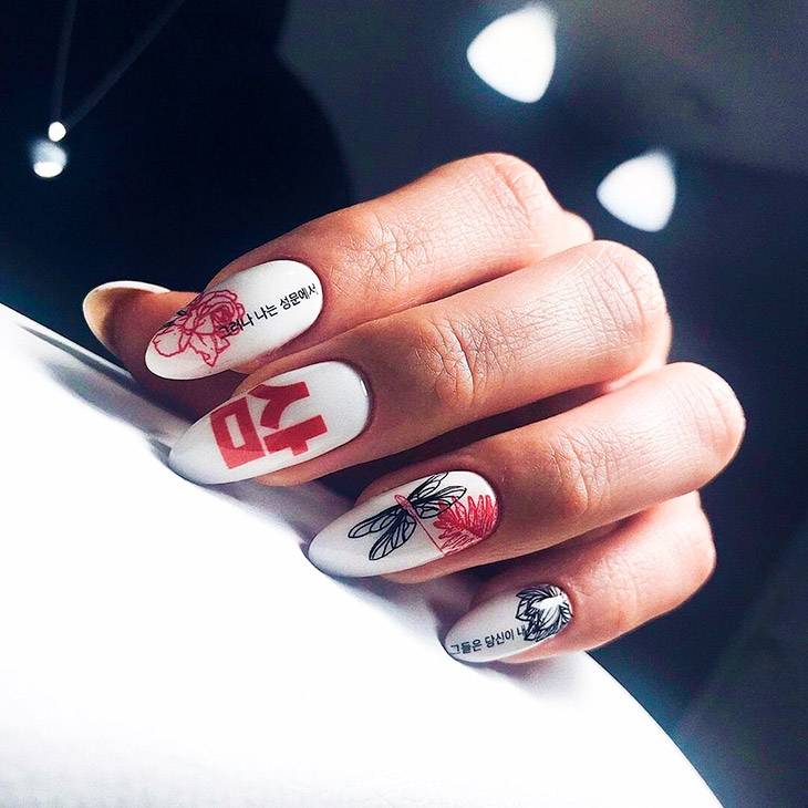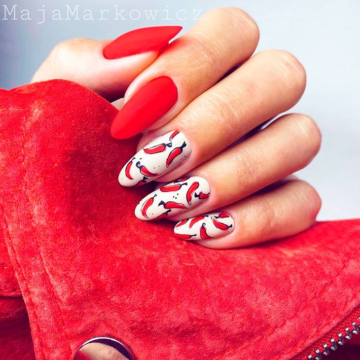 Добавление красного декора придает эффектности, дерзости, смелости. Сочетание тонов идеально для французского маникюра, создания легких узоров, добавления кружева или геометрии. Для этой цветовой гаммы используйте любимые декоративные элементы.