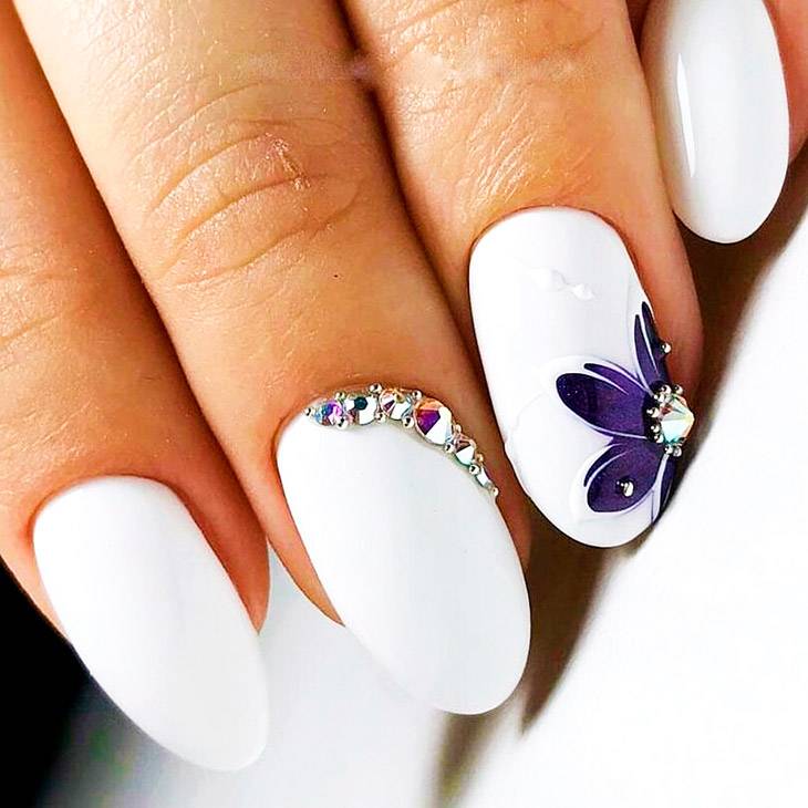 Белый цвет, в том числе и в дизайне ногтей, символичен свадебному образу невесты. Эффектный белоснежный лак можно использовать самостоятельно в глянцевом или матовом варианте, а также эффектно декорировать в разных техниках. Среди самых востребованных и красивых дизайнов в этом году – жемчужно-белая пудра, золотистые изысканные узоры и орнаменты, геометрические мотивы, нежнейшая паутинка, точечное украшение декоративными камнями, стразами, небрежные мазки цветом, контрастирующим с белым, кружево стемпинг или узор, голографические камифубуки, серебристый глиттер у основания или кончика ногтя.