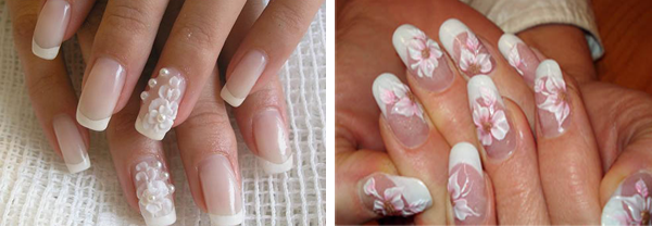 Также для свадьбы подойдет аквариумный дизайн на светлом фоне. Принцип заключается в том, что декор, который хотите использовать, будет покрыт сверху прозрачным акрилом. Из других популярных вариантов стоит выделить классический френч с кружевами или ажур. Этот вариант выражает нежность и изящность.