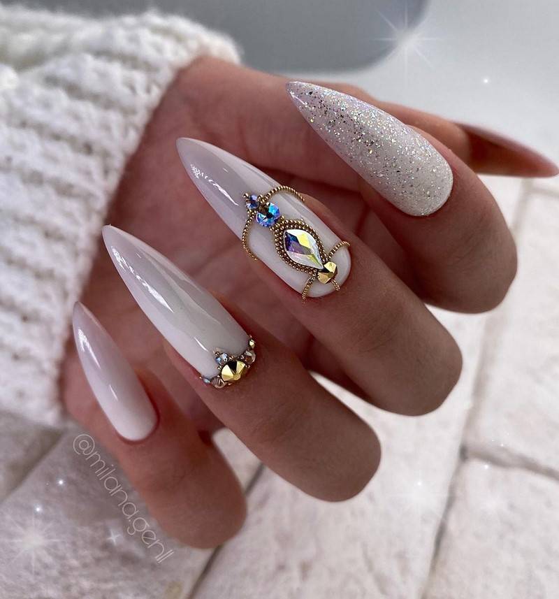 Белизна и золото — это выигрышное и роскошное сочетание красок. В качестве третьего оттенка добавьте черный, синий или красный. Для декора используют фольгу, блестки, ремешки со стразами.